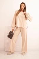 Komplet damski bawełniany z szeroką nogawką i bluzą z długim rękawem beżowy